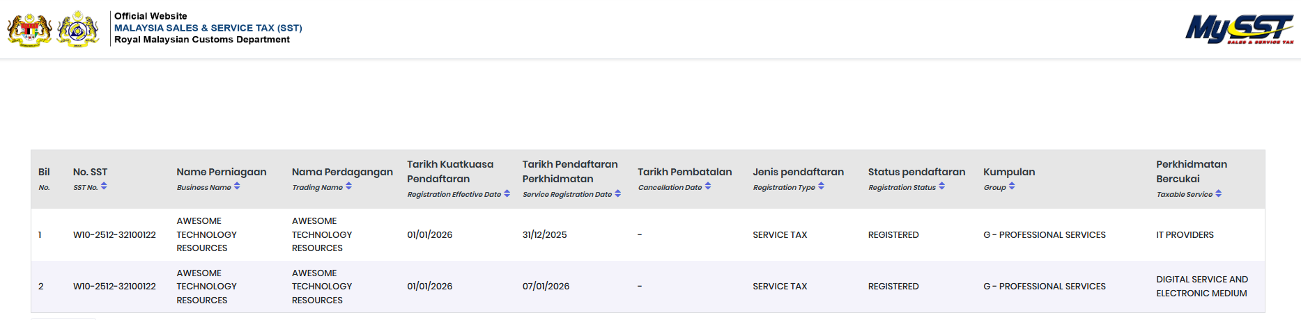 SST REGISTRATION STATUS